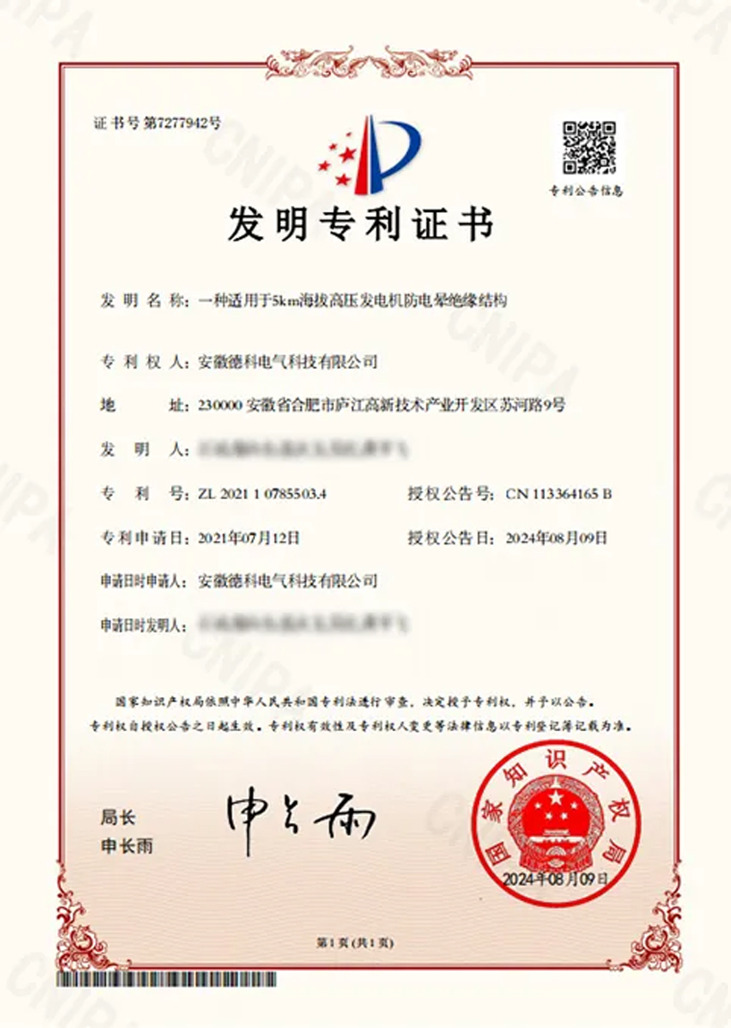 由安徽UED官网电气科技有限公司申请的《一种适用于5km海拔高压发电机防电晕绝缘结构》发明专利和《一种发电机减震底座》等五项实用新型专利,获得了国家知识产权局的批复,正式获得专利授权。UED官网电气一直坚持自主研发和技术创新,所有产品皆拥有自主知识产权,截至目前共获得国家授权专利64项(其中:发明专利19项)。