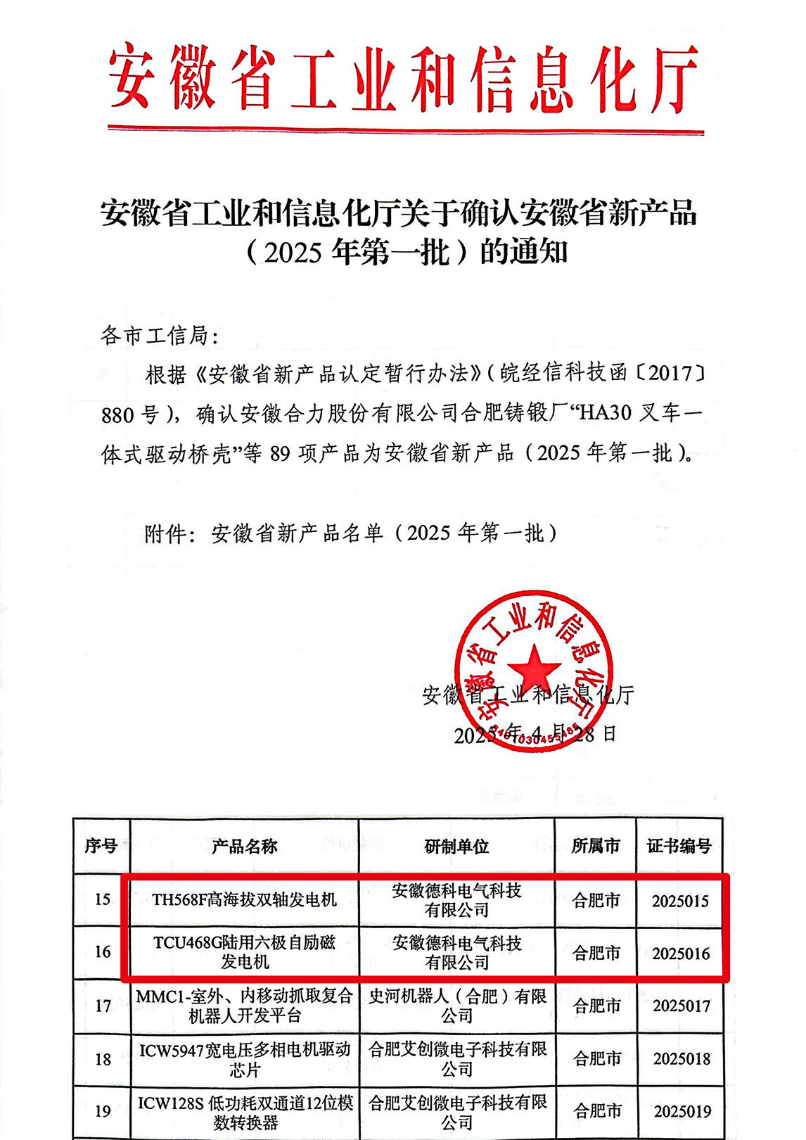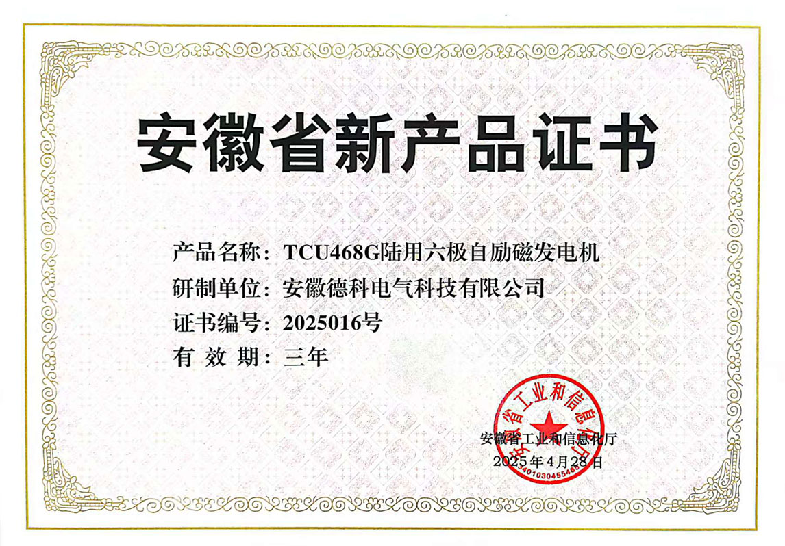 近日,安徽省工业和信息化厅正式发布《2025年第一批安徽省新产品认定名单》,UED官网电气自主研发的 TCU468G陆用六极自励磁发电机 与 TH568F高海拔双轴发电机 凭借领先技术优势与卓越性能,双双通过权威评审,成功入选!